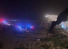طواقم الدفاع المدني ومتطوعون من المواطنين أثناء محاولة إخماد حريق اندلع في مستودع تابع لمنظمة إغاثة في حي الرمال، غرب مدينة غزة، في 13 فبراير/شباط 2026.