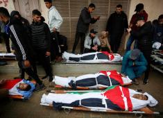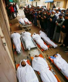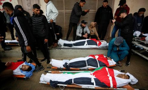 أقارب الضحايا يلقون نظرة أخيرة على جثامين فلسطينيين سقطوا في غارة جوية إسرائيلية شرق مخيم المغازي