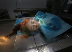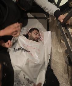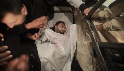 جثمان الزميل الصحفي محمد وشاح، مراسل قناة الجزيرة مباشر، الذي اغتيل في غارة جوية إسرائيلية استهدفت مركبته في شارع الرشيد غرب مدينة غزة في 8 أبريل/نيسان 2026. (صورة: بلال أسامة)