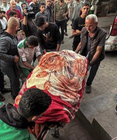 فلسطينيون ينقلون الشهداء والجرحى إلى مستشفى شهداء الأقصى في دير البلح وسط قطاع غزة في 22 نوفمبر 2025. تصوير: أحمد إبراهيم