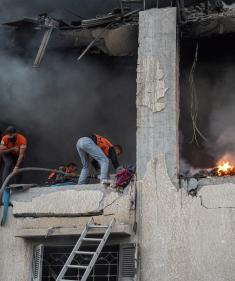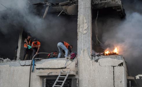 أفراد الدفاع المدني يبحثون في منزل محترق استهدفه غارات جوية إسرائيلية في مدينة غزة، في 22 نوفمبر/تشرين الثاني 2025. تصوير: عمر أشتوي