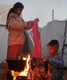 وسط خيام النازحين في المخيم المصري بمنطقة نتساريم وسط قطاع غزة، يحاول السكان الحفاظ على تفاصيل حياتهم اليومية رغم الظروف القاسية والنقص الحاد في الضروريات الأساسية كالمأوى والغذاء والماء النظيف. وسط قطاع غزة، ١٢ فبراير ٢٠٢٦. تصوير: محمد الأسود