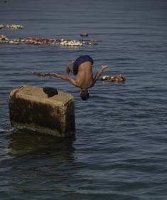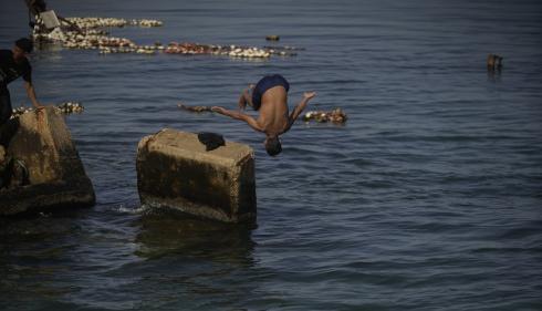 أطفال يسبحون قرب ميناء غزة المدمر جراء الحرب