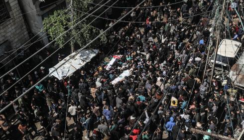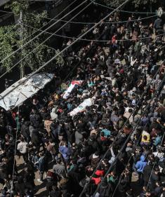 حضر أهالي غزة، في 7 أبريل/نيسان 2026، جنازة فلسطينيين استشهدوا في غارة جوية إسرائيلية استهدفت مدنيين متجمعين شرق مخيم المغازي للاجئين وسط قطاع غزة، في انتهاك لوقف إطلاق النار. (صورة: معز صالحي)
