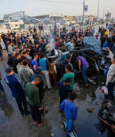 يتفقد فلسطينيون آثار غارة جوية إسرائيلية استهدفت مركبة في شارع صلاح الدين قرب مدخل مخيم المغازي للاجئين وسط قطاع غزة، في 4 أبريل/نيسان 2026 (صورة: أحمد إبراهيم)