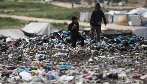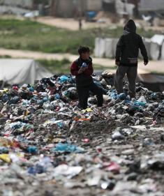 أطفال فلسطينيون يبحثون بين أكوام القمامة عن بقايا الطعام أو الألعاب في مكب نفايات بمخيم البريج للاجئين وسط قطاع غزة، في 4 أبريل/نيسان 2026، بالتزامن مع يوم الطفل الفلسطيني، صورة:( رمزي أبو عامر)