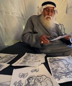 محمد زملط مسن فلسطيني اقتلعته الحرب من جباليا يحمل اليوم ريشته كوسيلة للبقاء، لا للفن فقط. في خيمته المتواضعة بمخيم البريج وسط قطاع غزة، تُصوّر أعماله معاناة الحرب بما في ذلك فقدانه لأبنائه، 12 أبريل/نيسان 2026، عدسة: يوسف أبو وطفة