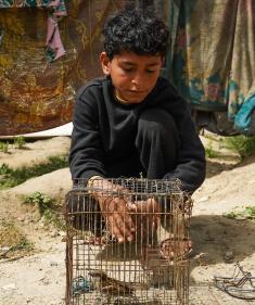 طفل فلسطيني يحمل قفصًا، محاولًا اصطياد الطيور لتربيتها لاحقًا كغذاء داخل خيمته، في مخيم البريج للاجئين وسط قطاع غزة، 4 أبريل/نيسان 2026، وسط نقص حاد في الغذاء وظروف إنسانية مزرية يواجهها السكان نتيجة الحرب. صورة: (رمزي أبو عامر)