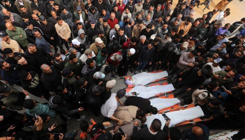 ودّع المشيّعون جثامين الفلسطينيين الذين سقطوا في غارة جوية إسرائيلية على مخيم الشاطئ للاجئين خلال جنازتهم في مدينة غزة في 15 أبريل/نيسان 2026. صورة: بلال أسامة