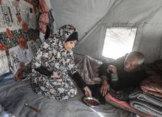 مخيم البريج: الفلسطينية سحر التلولي تعيش ظروف النزوح القاسية مع زوجها العاجز بعد أن فقدت ابنتيها خلال الحرب