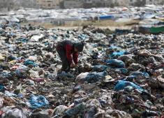 أطفال فلسطينيون يبحثون بين أكوام القمامة عن بقايا الطعام أو الألعاب في مكب نفايات بمخيم البريج