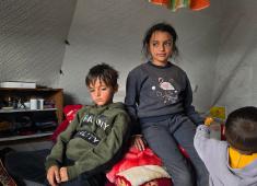 عائلة فلسطينية تحتمي من برد الشتاء القارس في خيمة نصبتها فوق منزلها المدمر قرب الخط الأصفر في خان يونس