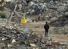 أطفال يلهون على أنقاض منازلهم المدمرة في خان يونس