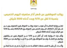 وزارة المالية: صرف رواتب موظفي القطاع العام اليوم بنسبة 70% وحد أدناه 3500 شيكل