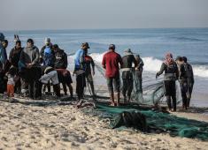 صيادون فلسطينيون نازحون يجمعون صيدهم من الشباك التي جلبوها إلى الشاطئ في دير البلح