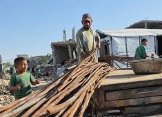 إعادة تدوير قضبان معدنية مُنتشلة من المباني المُدمرة في قطاع غزة