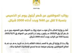 وزارة المالية برام الله: صرف رواتب الموظفين عن شهر أيلول يوم غدٍ الخميس بنسبة لا تقل عن 60% وبحد أدناه 2000 شيكل.