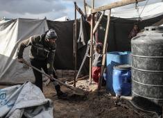 أب فلسطيني يحاول إصلاح خيمته بمخيم النصيرات