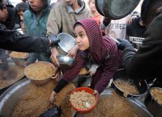 تجمع نازحون حاملين أوعية طعام لتلقي وجبات ساخنة وزعتها جمعيات خيرية في مدينة غزة