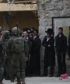 جنود إسرائيليون يتخذون إجراءات أمنية مشددة بإغلاق مداخل ومخارج منطقة البلدة القديمة في الخليل، جنوب الضفة الغربية، في 24 يناير/كانون الثاني 2026، خلال اقتحام مستوطنون يهود البلدة تحت حماية القوات الإسرائيلية. (صورة: مأمون وزواز)