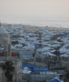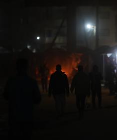 يسير فلسطينيون في أحد شوارع مدينة غزة، بينما يكافح النازحون في خيامهم لمواجهة الظلام، يتدفؤون ويطهون طعامهم بالحطب، محرومين حتى من أبسط مقومات الحياة. 23 يناير/كانون الثاني 2020.صورة: عمر أشتوي