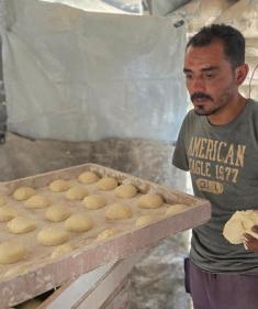 الفلسطيني محمد قحمان يعيد افتتاح مخبز تقليدي وسط أنقاض مدينة حمد غرب خان يونس، ويعمل جنباً إلى جنب مع أبنائه وصهره، وجميعهم من مبتوري الأطراف، 21 يناير/كانون الثاني 2026 . صورة: طارق محمد