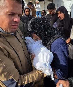 ينعى الفلسطينيون جثمان الطفلة سجود عليان في مجمع ناصر الطبي بمدينة خان يونس، جنوب قطاع غزة، في 24 يناير/كانون الثاني 2026، بعد سبعة أيام من ولادتها. (صورة: طارق محمد/وكالة الأنباء الفلسطينية)