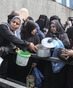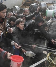 تجمع فلسطينيون نازحون داخلياً في مطبخ خيري لتلقي حصص غذائية محدودة وسط نقص حاد في الغذاء، في مخيم النصيرات للاجئين وسط قطاع غزة، 21 يناير/كانون الثاني 2026. صورة: معز صالحي