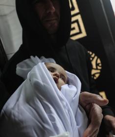 توفي الطفل علي أبو زور، البالغ من العمر ثلاثة أشهر، والذي وصل إلى مستشفى الشفاء في مدينة غزة، متأثراً بموجة البرد القارس التي ضربت مخيمات النازحين في غزة. 22 يناير/كانون الثاني 2026. صورة: عمر أشتوي
