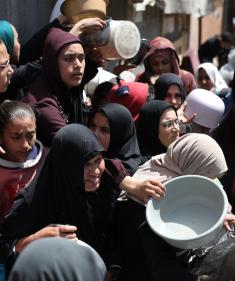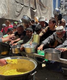 يتلقى فلسطينيون نازحون طعامًا من مطبخ خيري في مخيم النصيرات للاجئين وسط قطاع غزة، في 23 أبريل/نيسان 2026، (صورة: يوسف أبو وطفة)