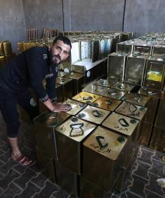 عمال فلسطينيون يجهزون صفائح زيت الزيتون لتصديرها لدول الخليج في مدينة خان يونس جنوب قطاع غزة
