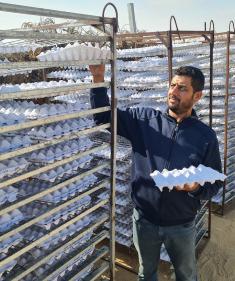 أكرم العمور من خان يونس جنوب قطاع غزة يلجأ إلى ابتكار فكرة مميزة لتوفير عمل خاص به عبر تحويل النفايات الورقية إلى كراتين للبيض