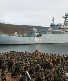 روس يحتشدون بالقرب من سفينة تتبع للأسطول البحري قبل انتقالهم إلى مراكز التدريب بعد إعلان الرئيس بوتين التعبئة الجزئية
