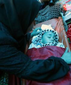 أقارب الطفل الشهيد ريان سليمان الذي استشهد، جراء سقوطه من علو، أثناء مطاردته من قبل قوات الاحتلال يلتفون حول جسده في المستشفى في مدينة بيت لحم