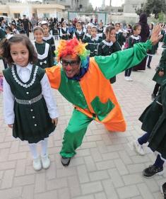 مهرجون فلسطينيون يشاركون في فعاليات التفريغ النفسي للطلبة خلال اليوم الأول من العام الدراسي الجديد في خان يونس جنوب قطاع غزة