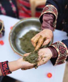 نساء فلسطينيات يقمن بإعداد الحناء خلال حفل تقليدي في مدينة خانيونس