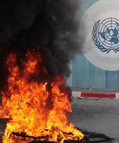 متضرري العدوان الإسرائيلي عام 2014 يحرقون الاطارات خلال وقفة للمطالبة باعادة بناء منازلهم، أمام مقر وكالة الغوث "الأونروا" في غزة