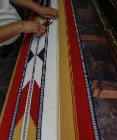 بتركيز ودقة ينسج السبعيني محمود الصواف،السجاد اليدوي باستخدام "النول الخشبي" داخل مشغله الصغير والبسيط في غزة