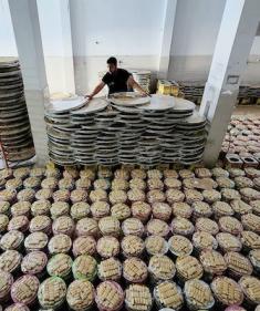 فلسطينيون يجهزون الحلويات داخل أحد المصانع استعدادا لنتائج الثانوية العامة "التوجيهي" في مدينة خانيونس