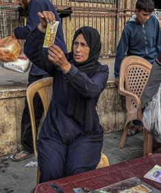 الفلسطينية منال السعيداني تُصلح أوراقًا نقدية قديمة ومهترئة في مخيم النصيرات، وسط قطاع غزة، تصوير: بلال أبو عامر
