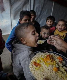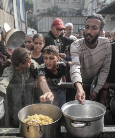 طوابير طويلة للحصول على وجبات ساخنة توزعها جمعيات خيرية في قطاع غزة. تصوير: معز صالحي