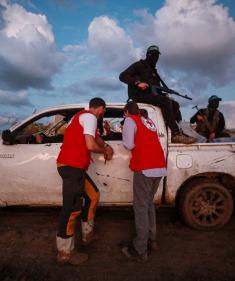 عمليات البحث لاستعادة جثث الرهائن الإسرائيليين، يجريها أعضاء من كتائب القسام، ومسؤولون من اللجنة الدولية للصليب الأحمر في حي الزيتون بقطاع غزة. تصوير: عمر أشتوي