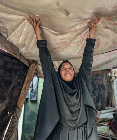 يُكافح النازحون الفلسطينيون لمواجهة ظروف معيشية صعبة مع اقتراب فصل الشتاء، مخيم النصيرات وسط قطاع غزة، 5 نوفمبر 2025، تصوير: بلال أبو عامر