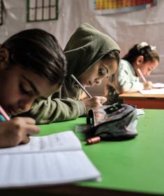 أطفال فلسطينيون نازحون يحضرون درسًا داخل خيمة تُستخدم كفصل دراسي مؤقت في ملجأ بدير البلح