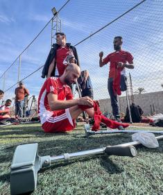 رياضيون فلسطينيون مبتورو الأطراف ضمن فعاليات بطولة الأمل لكرة القدم التي نظمتها جمعية "دنيز فينيري" واتحاد كرة القدم الفلسطيني في دير البلح.تصوير: بلال أبو عامر