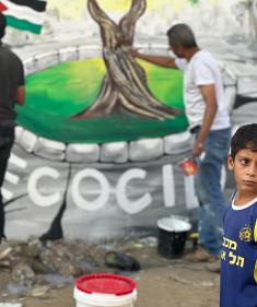 جدارية وسط أنقاض المباني المدمرة في خان يونس، جنوب قطاع غزة، تصور شجرة زيتون - رمز السلام - قبل عرضها في قمة المناخ في البرازيل، كرسالة من غزة إلى العالم عن الصمود والأمل. تصوير: طارق محمد