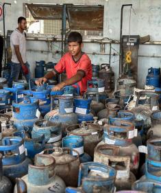 عمال يتعاملون مع أسطوانات الغاز في محطة تعبئة في النصيرات، وسط قطاع غزة، في وقت يعاني فيه القطاع من أزمة حادة في إمدادات الوقود.تصوير: بلال أبو عامر