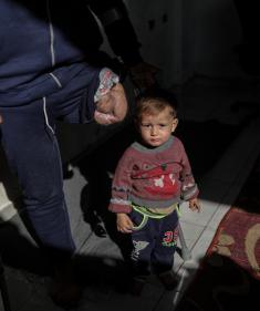 في اليوم العالمي للأشخاص ذوي الإعاقة، الطفل محمد المبيض (١٢ عامًا) يقضى وقته في الرسم واللعب بلعبة صنعها بنفسه خلال فترة علاجه الطويلة، محاولًا التمسك بالحياة رغم كل المصاعب.تصوير: عمر أشتوي
