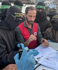 مسلحون من حماس والجهاد الإسلامي في فلسطين يسلمون لأفراد الصليب الأحمر جثة استعادوها من بيت لاهيا قبل تسليمها لإسرائيل لتحديد ما إذا كانت تعود لأحد الرهائن، شمال قطاع غزة، 3 ديسمبر/كانون الأول 2025