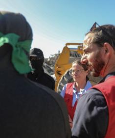 فرق من كتائب القسام ومسؤولون من الصليب الأحمر إلى جانب آليات ثقيلة تابعة لمصر،تجري عمليات بحث في حي الزيتون بمدينة غزة لاستعادة جثة إسرائيلي في 8 ديسمبر/كانون الأول 2025. تصوير: عمر أشتوي